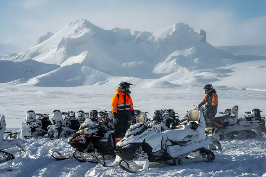 Then comes the action-packed part of the tour – snowmobiling on Langjökull Glacier. As you zoom through the snow, marvel at ice formations, craters, and mountain ranges dotting the horizon. Speeding through the vast expanse of white, enjoy the sights and the blowing wind. Conclude the route with the cascading waters of Gullfoss Waterfall, then stop at the volcanic Kerið crater on the way back to Reykjavík.