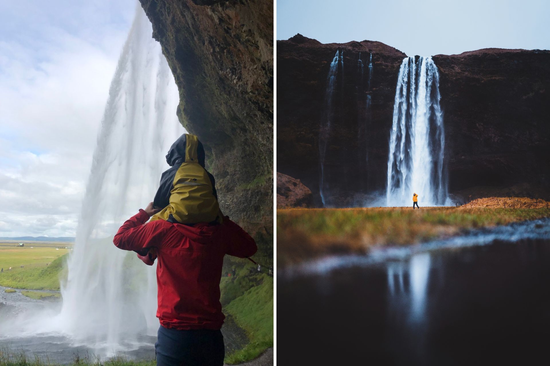 - Seljalandsfoss – Walk behind this famous waterfall, find the “secret” bonus waterfall, relish in the green cliffs filled with bird life. Don’t forget your rain gear. Even on the sunniest of days, this stop gets wet.