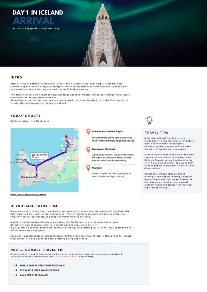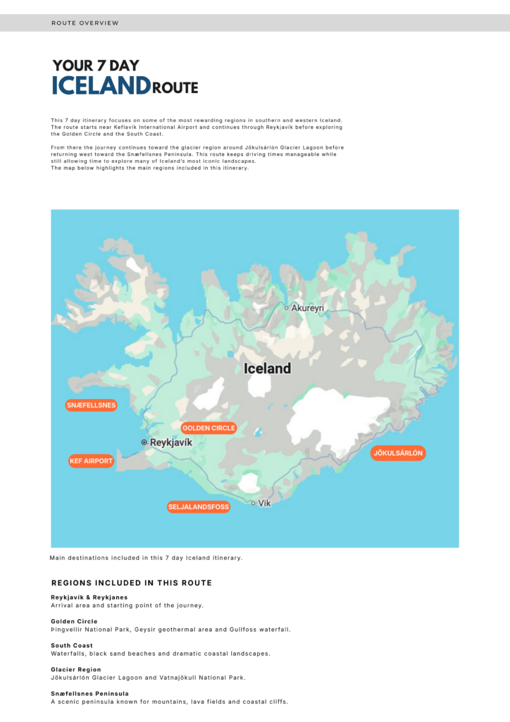 Ultimate 7 Day Iceland Road Trip Itinerary Plan your Iceland adventure with this detailed 7 day self drive itinerary, designed to help you explore some of the country’s most rewarding regions at a practical pace. This guide includes a complete day by day route covering the Golden Circle, South Coast, glacier lagoon region, West Iceland, and Snæfellsnes Peninsula, along with suggested stops, travel tips, and optional detours along the way. Perfect for first time visitors who want a well structured road trip without spending hours planning every detail. What’s included 11 page downloadable PDF Day by day itinerary Suggested stops and highlights Route overview map Travel tips for each day Extra stop suggestions Final planning resources Best for First time visitors to Iceland Self drive travelers Spring, summer, and early autumn trips