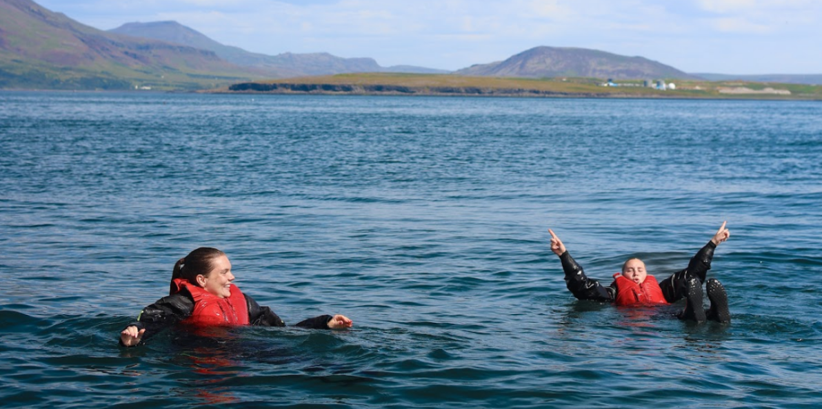 We start at our base in Gufunes, where you’ll get suited up in a warm, waterproof drysuit with a fleece layer underneath — perfect for Iceland’s unpredictable weather.
