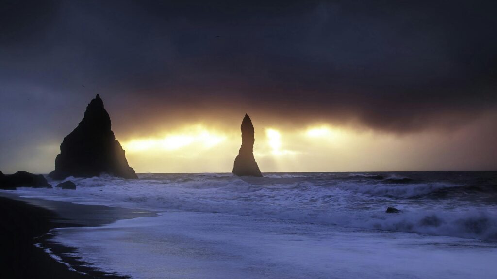 The beach is formed from volcanic sand created by centuries of erosion from nearby eruptions and glaciers. Towering basalt columns known as Reynisdrangar rise from the ocean just offshore. According to legend, they are trolls turned to stone by sunlight while trying to drag ships to shore.