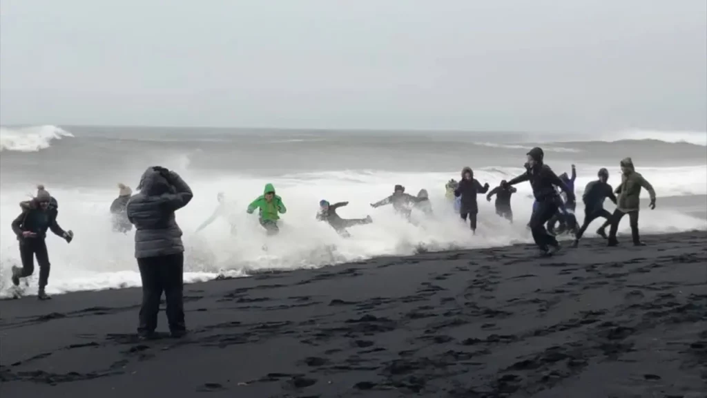 When you arrive at Reynisfjara, you’ll be greeted by vast stretches of black volcanic sand, dramatic rock formations, and the thunder of Atlantic waves. The beach is breathtaking but also dangerous, sneaker waves can appear suddenly and sweep people into the sea. Swimming is strictly forbidden, and visitors must always stay far back from the water’s edge.